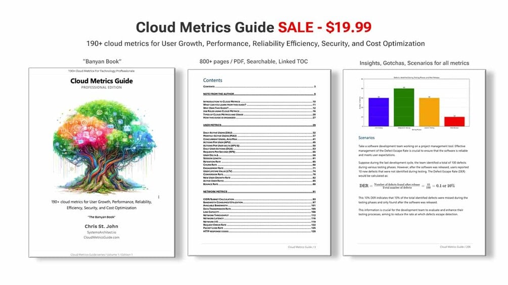 The Cloud Metrics Guide ("Banyan Book") is packed with over 190+ cloud metrics and 800+ pages, in detail, with scenarios, gotchas, diagrams and best practices, providing an important resource for those eager to apply learned insights for success.